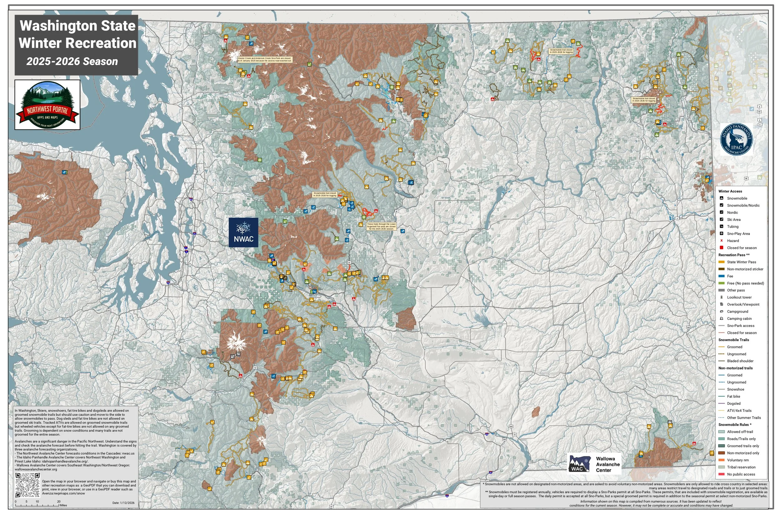 After a late start to the 2025-2026 winter season in the Pacific Northwest and a December atmospheric river that melted much of the early season snow pack, the winter recreation season has finally started. Every year, Northwest Portal works with land managers, groomers and grooming coordinators to update our web and print maps with the latest information. This information is available on our interactive web map that you can access through our browser, and on GeoPDF tabloid and poster sized maps that you can buy from our website to download and print, view in your browser, or use in a GeoPDF reader such as Avenza.