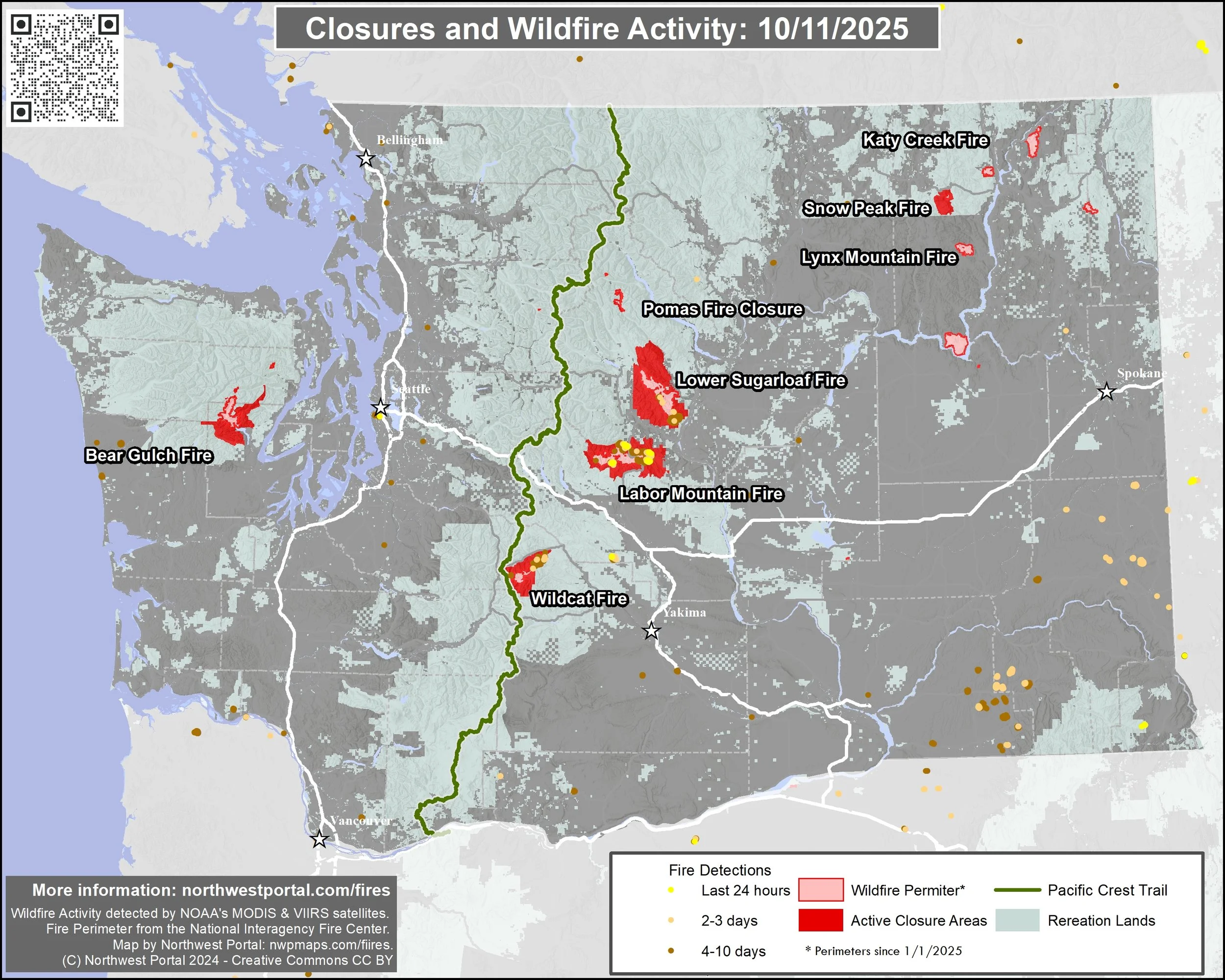 Fire activity deteced by the NOAA VIIRS satellites. This provides an approximation of current fire activity, but not all fire activity is detected by these satellites. Fire perimeters are as mapped by the National Inter-agency Fire Center and represent the maximum extent of the fire. These maps are offered under an open license. For a custom map email: contact@northwestportal.com.