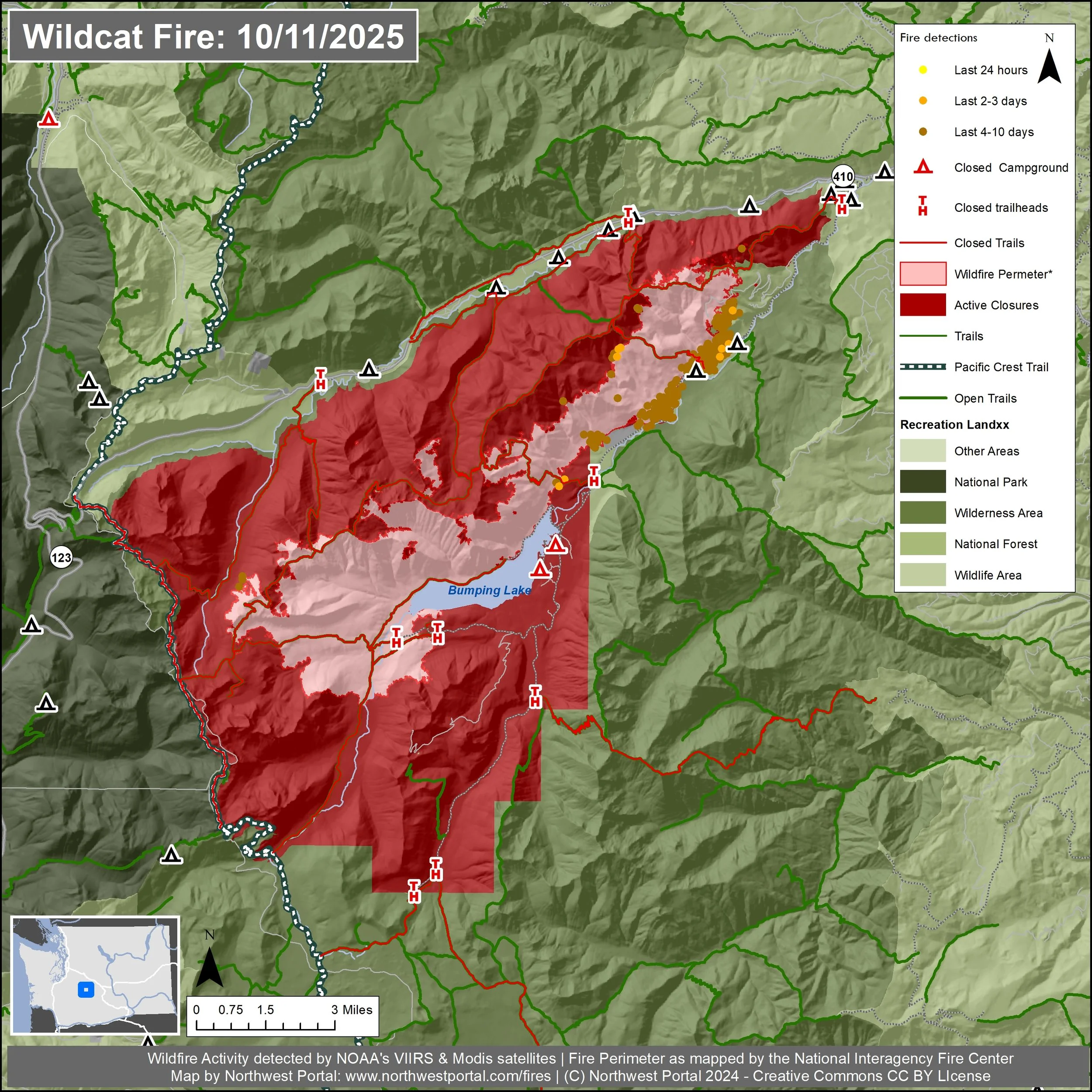 Wildcat Fire: This fire in the William O’Douglas Wilderness in Yakima County was started by lightning strike on 8/25/2025. As of 10/10 it is 15,592 acres, 5% contained and has 409 personnel assigned. Find more information on this fire at Wildcat Fire 2025 official Facebook page managed by the National Forest.