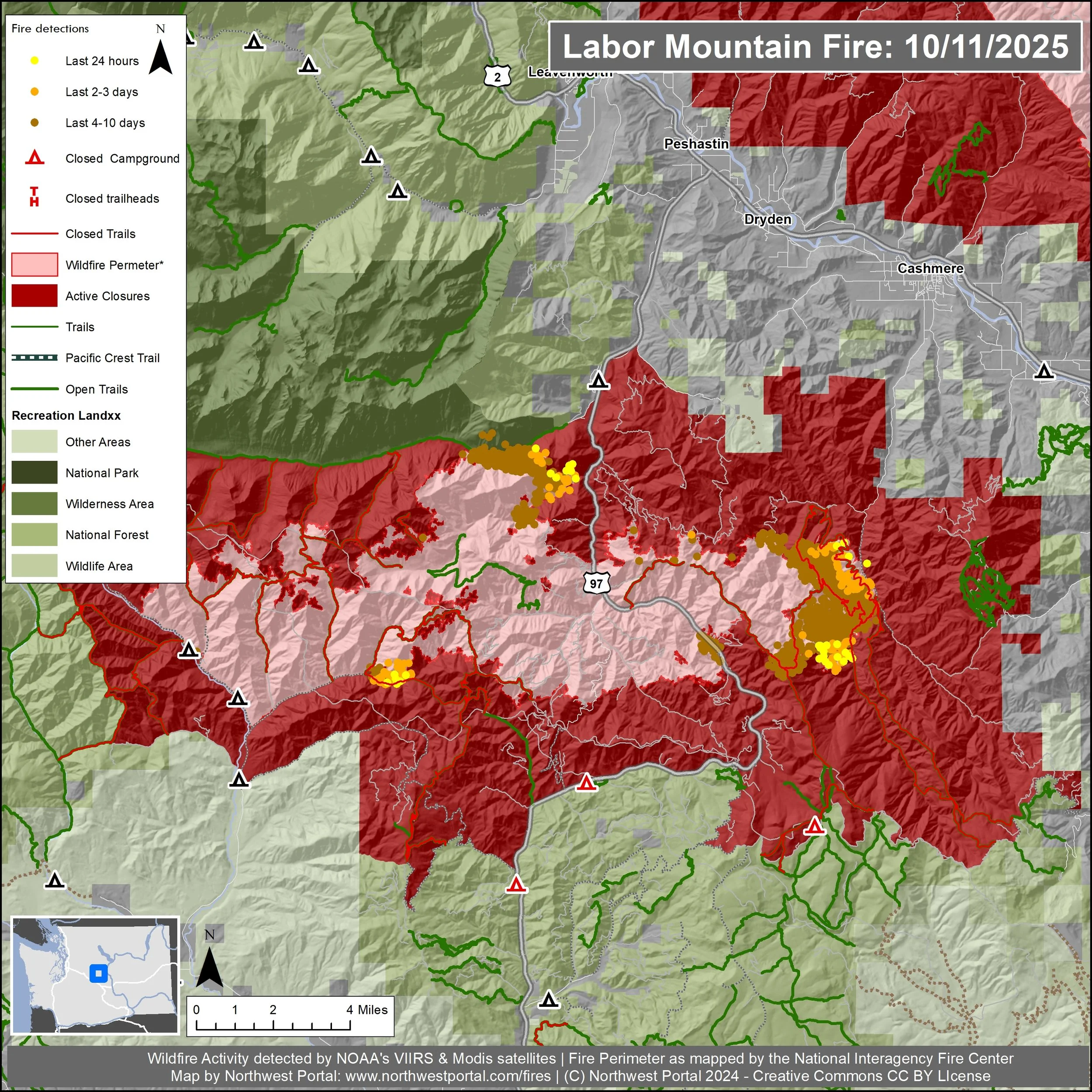 Labor Mountain Fire: This lightning sparked fire in Okanogan Wenatchee National Forest north of the Teanaway Community Forest started on 10/12/2025. As of 9/28, it is 42,631 acres, 20% contained.